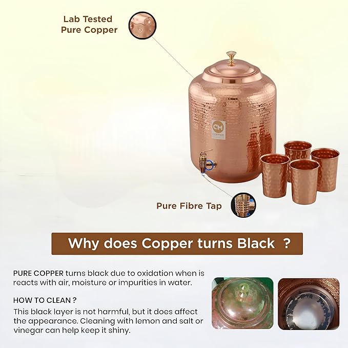 Easy to clean for, Copper Master combo set of water dispenser and glasses needs to be hand-washed with pitambari powder followed by a soft wipe with a dry & clean cotton cloth.